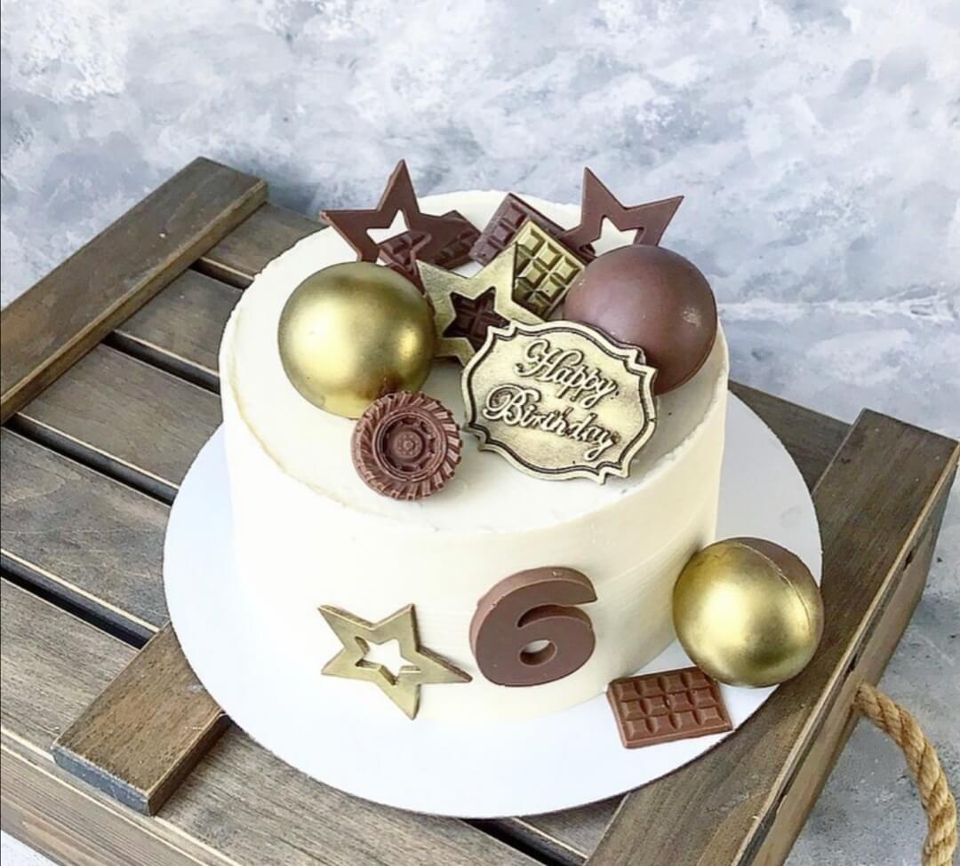 Крупные шоколадные акценты на поздравительном тортике - отличный вариант украшения для любых случаев и поводов