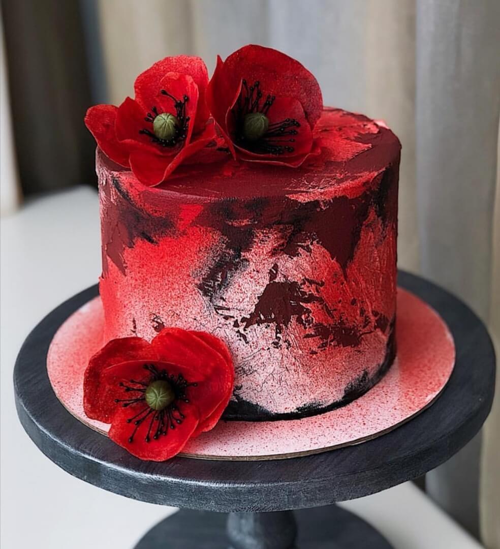 Притягивающий к себе внимание алый торт с красивейшими маками станет одним из главных украшений праздничного вечера