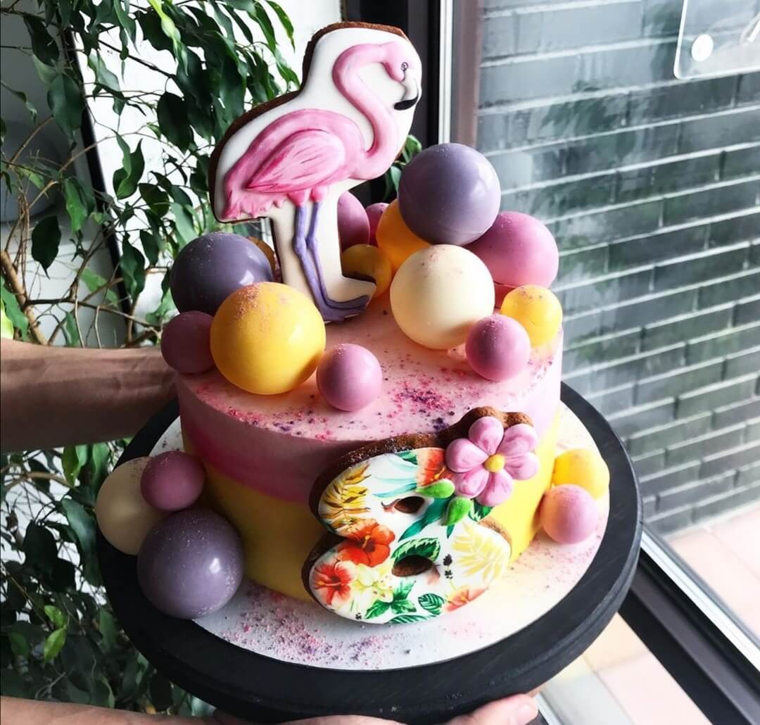 Яркий, необычный и праздничный тортик для маленьких любительниц розовых цветов и этих чудесных тропических птиц